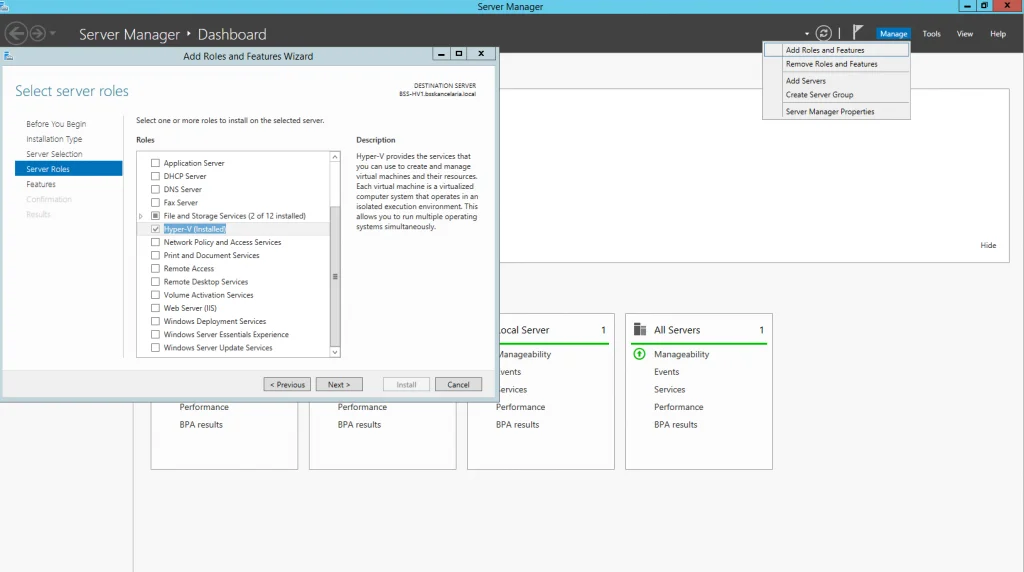 To install Hyper-V on a server, open Server Manager, which is located in the "Start" menu. Then, go to the "Management" tab and select "Add Roles and Features." In the Add Roles wizard, select "Role-based or Feature-based Installation," select the target server, and then select "Hyper-V" from the list of roles.
