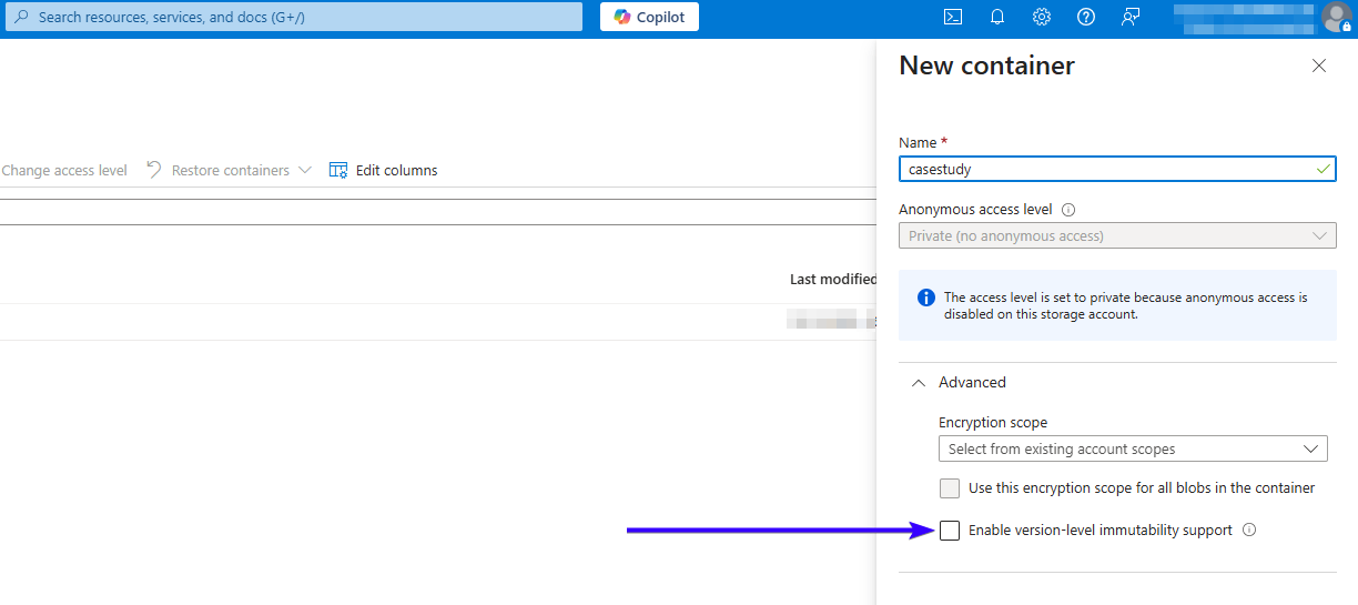 Fig 1. Microsoft Azure panel view: Enabling the “Version-level immutability support” option for a new container.