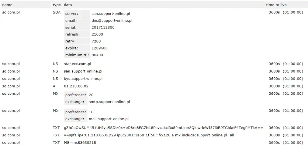 Rysunek 3 Rekordy DNS dla domeny so.com.pl