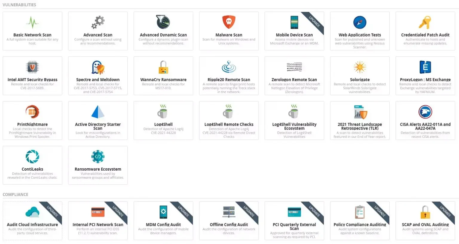 Nessus dostarcza 22 skany podstawowe (bezpłatne) oraz 8 po wykupieni licencji. Do najciekawszych należą: skan urządzeń mobilnych, audyt chmury czy konfiguracji MDMa.