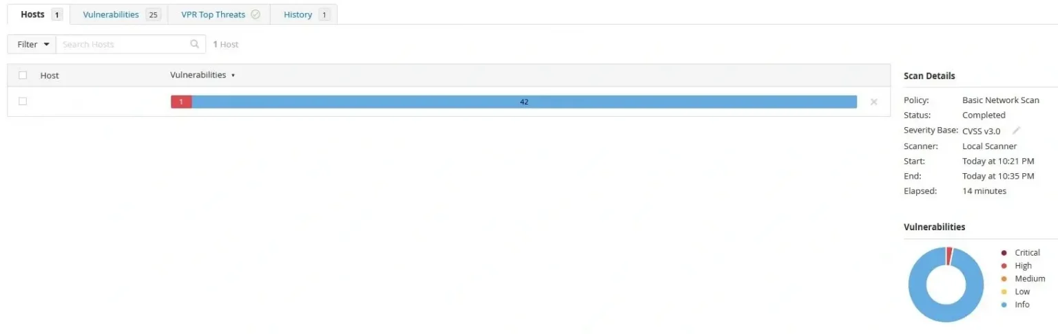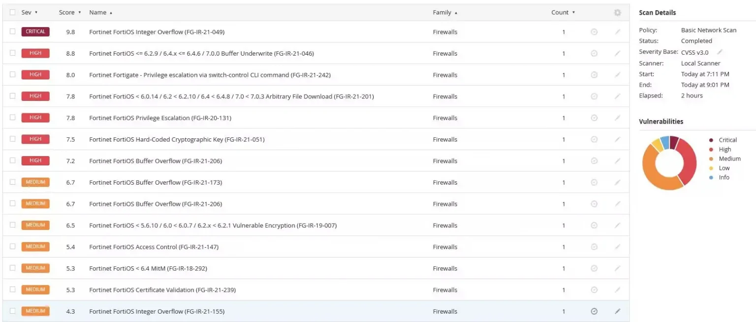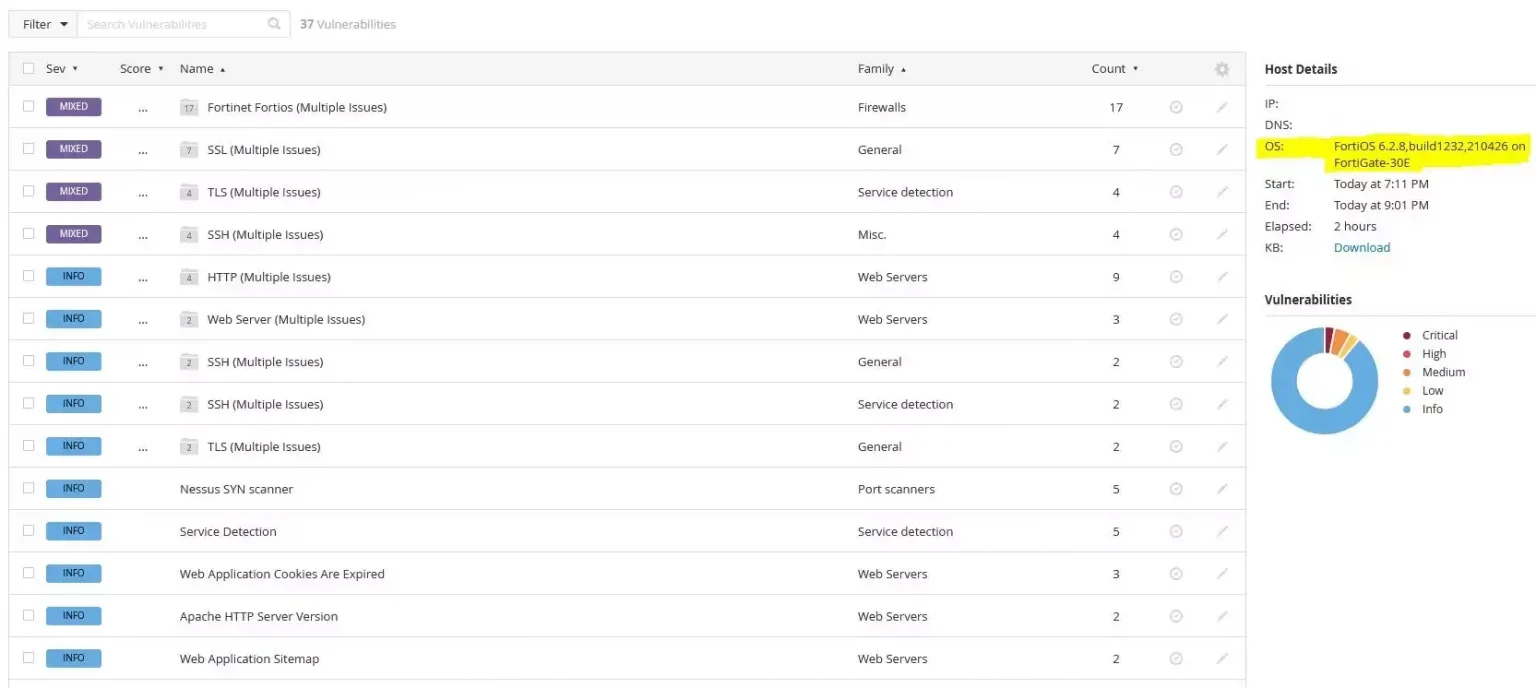 Rezultat skanu podstawowego przedstawia wszystkie znalezione (zgodnie ze skonfigurowanymi ustawieniami) podatności i informacje na temat skanowanego obiektu. W tym przypadku jest to adres publiczny routera FortiGate skanowany bez uwierzytelnienia, z Internetu.