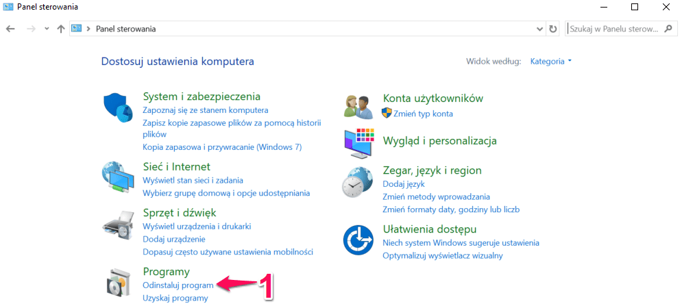 Po restarcie komputera możemy zająć się zbędnymi programami w naszym systemie. Otwieramy Start i wpisujemy „Panel Sterowania” – uruchamiamy go. Wybieramy „Odinstaluj program”.