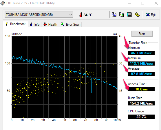 - Wynik Access Time – im mniejszy tym lepiej. W przypadku dysku HDD Access Time na poziomie do 20ms jest akceptowalny.