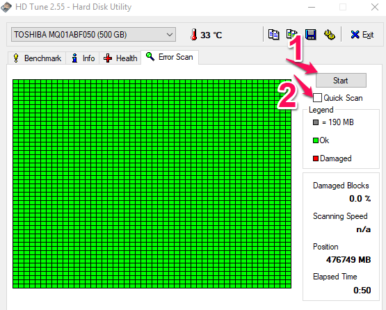 Sprawdzany przeze mnie dysk przeszedł test prędkości pomyślnie. Uruchomiony został jeszcze test na obecność Badsector’ów z zakładki „Error Scan”. Wybieramy zatem tę zakładkę, a następnie analogicznie do poprzedniego przypadku klikamy przycisk „Start”. Efekt zakończonego testu przedstawia zrzut poniżej.