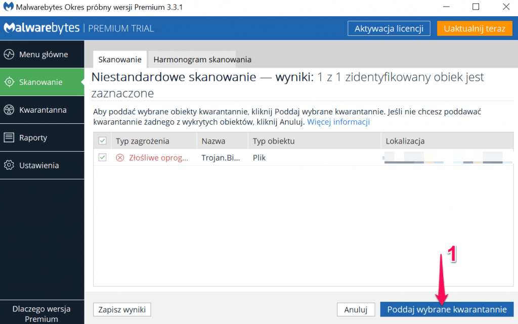 W tym przypadku udało się wykryć jedno zagrożenie. Klikamy „Poddaj wybrane kwarantannie”