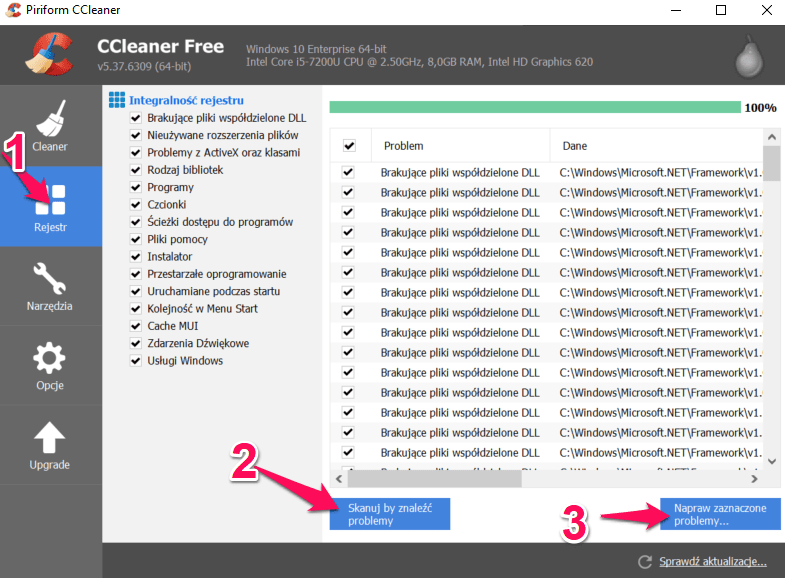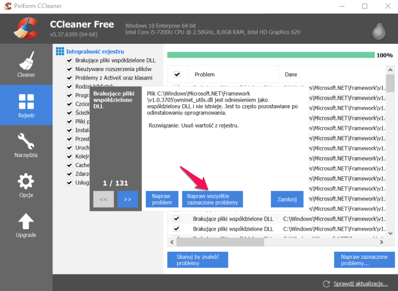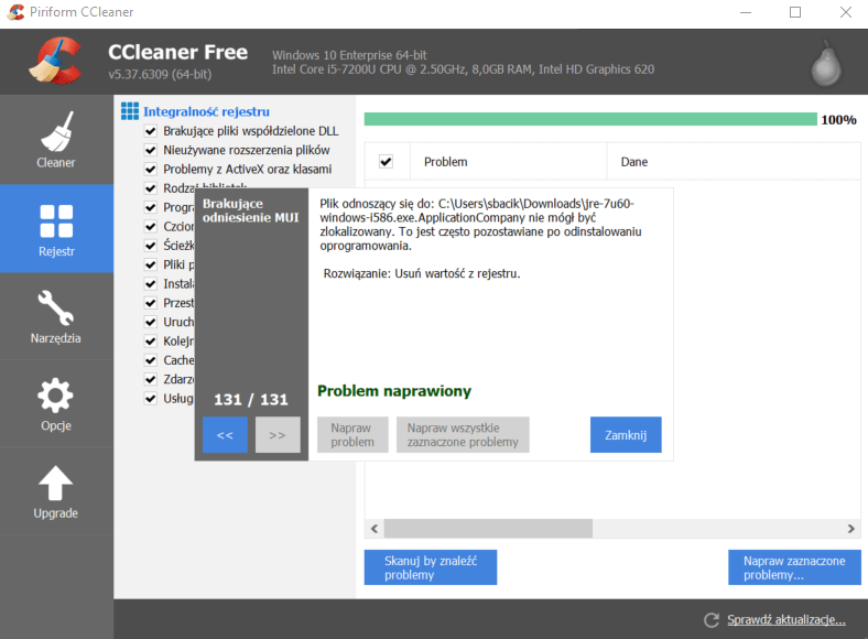 Po deinstalacji wszystkich zbędnych programów przechodzimy do wyczyszczenia Rejestru ze wszystkich nieużywanych wpisów. Dokonamy także analizy weryfikującej, ile miejsca z dysku możemy zwolnić poprzez usunięcie plików tymczasowych.