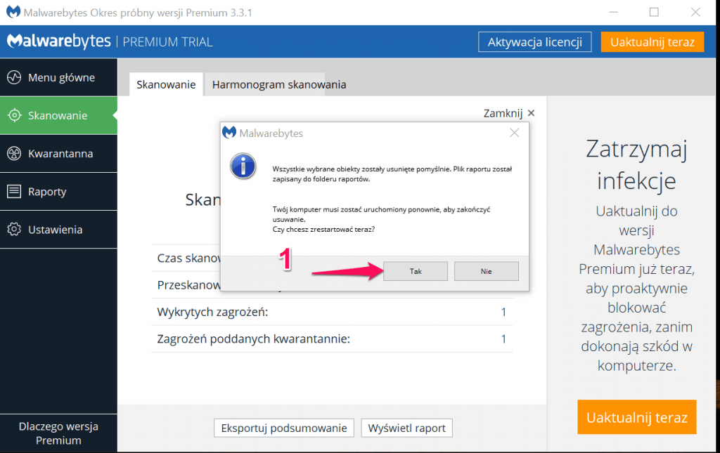 By usunąć w całości wszystkie zagrożenia musimy ponownie uruchomić komputer.