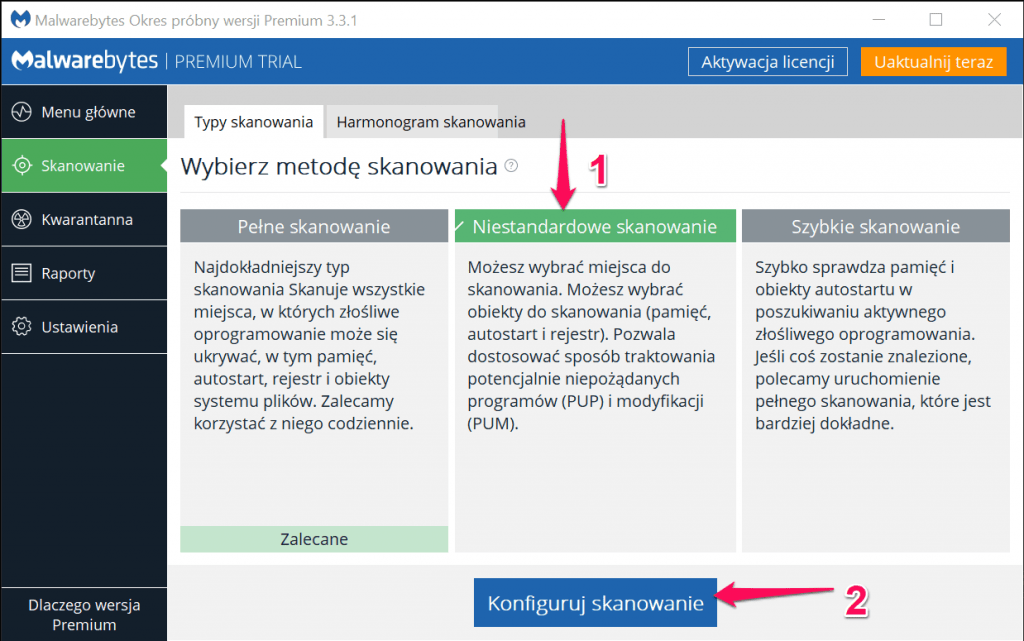 W zakładce skanowanie zaznaczamy „Niestandardowe skanowanie” i klikamy „konfiguruj skanowanie”