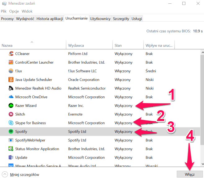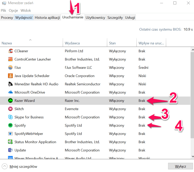 Jak widać na powyższym zrzucie zainstalowane są trzy aplikacje, które powodują spowolnienie komputera podczas uruchamiania: „Razer Wizard (2)”,”Skype for Business (3)” oraz ”Spotify (4)”. By je wyłączyć wystarczy kliknąć na wybranej aplikacji a następnie nacisnąć przycisk „Wyłącz”.