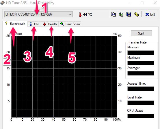 Na samej górze możemy wybrać dysk, który poddamy testom (1), następnie mamy podział na 4 moduły. „Benchmark (2) – test wydajnościowy”, „info (3) – informacje o zajętości dysku i jego parametrach”, „Health (4) – przedstawienie wszystkich atrybutów dysku które bada HDTune. Jeżeli po wejściu w zakładkę Health zobaczymy na którejkolwiek z pozycji kolor żółty bądź czerwony oznacza to że dysk jest uszkodzony i trzeba przygotować się na jego wymianę”, „Error Scan (5) – test logiczny dysku”. Od wyników testu z zakładek „Benchmark (2)” oraz zakładki „Error Scan (5)” będzie zależała decyzja o uszkodzeniu dysku.