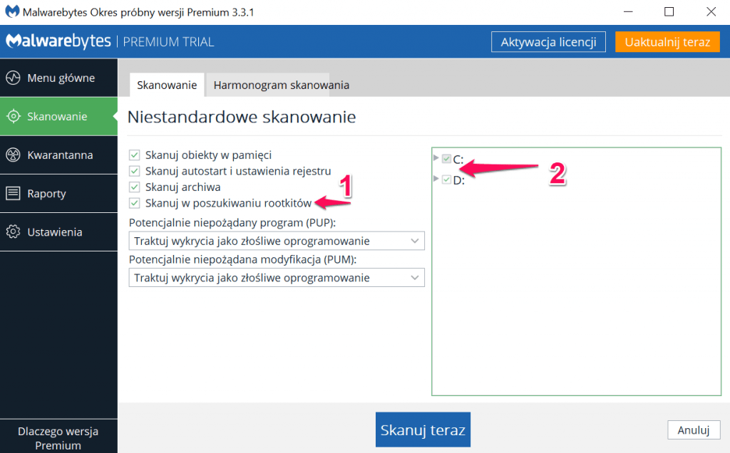 Na kolejnym ekranie zaznaczamy dodatkową opcję „Skanuj w poszukiwaniu rootkitów” oraz wybieramy dyski, które chcemy skanować. Klikamy „Skanuj teraz”