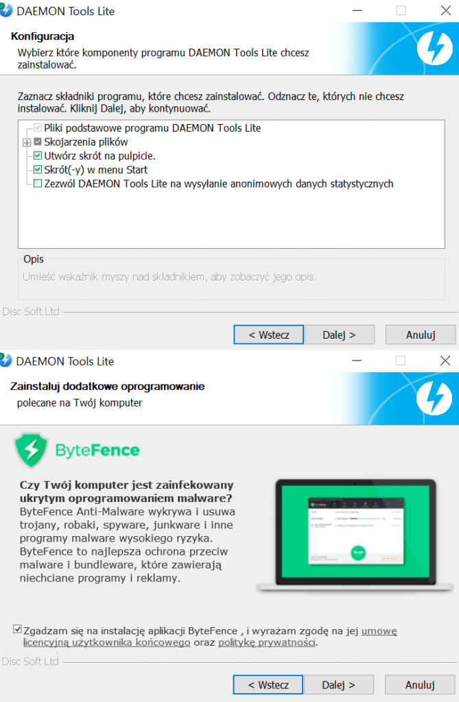 Niechciane programy – to oprogramowanie, które instaluje się jako „extra dodatek” do programów pobieranych z Internetu. Zwykle nawet nie zdajemy sobie sprawy, że pomimo programu, który chcieliśmy zainstalować, Instalator domyślnie wymusił na nas wgranie np. dwóch dodatkowych pasków narzędzi (z ang. Toolbar) do przeglądarki i jednego programu do odtwarzania muzyki.Niestety, ale tego typu sytuacje zdarzają się nawet doświadczonym użytkownikom i są bardzo uciążliwe. By się przed nimi uchronić warto skupić swoją uwagę na wszystkich zaznaczonych opcjach podczas procesu instalacji wybranego programu. Należy je skontrolować, a następnie odznaczyć te, które wydają się być osobnymi programami. Najczęściej mają one w nazwach słowa kluczowe typu ”toolbar, player, manager, antyvirus”. Jeśli podczas instalacji natkniemy się na tego typu opcje w instalatorze, które domyślnie są zaznaczone, należy je wyłączyć. Poniżej znajduje się zrzut ekranu wykonany przy instalacji programu Deamon Tools, który domyślnie doinstalowałby na naszym komputerze program ByteFance.