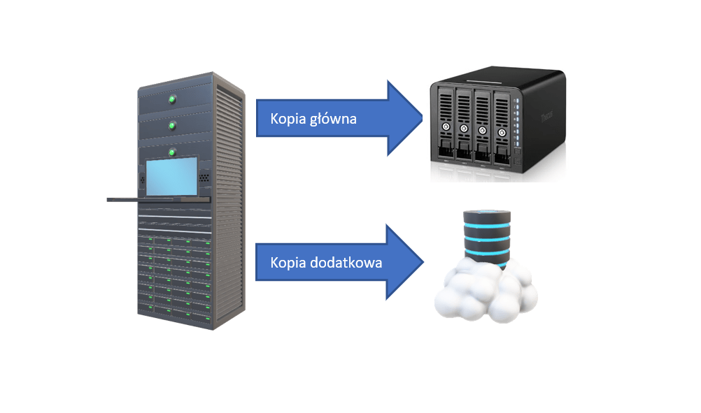 Bardzo istotne jest, aby kopia zapasowa była przetrzymywana na minimum dwóch niezależnych nośnikach. Dodatkowo jeden z nośników powinien znajdować się fizycznie poza serwerownią. Ochroni to przed scenariuszem, w którym główne repozytorium bądź kopia na nim wykonana zostaną uszkodzone. Taka sytuacja może mieć miejsce podczas pożaru, zalania czy innego zdarzenia. Jako przykład może tu posłużyć wykonywanie głównej kopii zapasowej na urządzenie typu NAS oraz dodatkowej kopii na zewnętrzny, wynoszony dysk USB czy repozytorium chmurowe. Ten dodatkowy backup może być wykonywany z mniejszą częstotliwością.