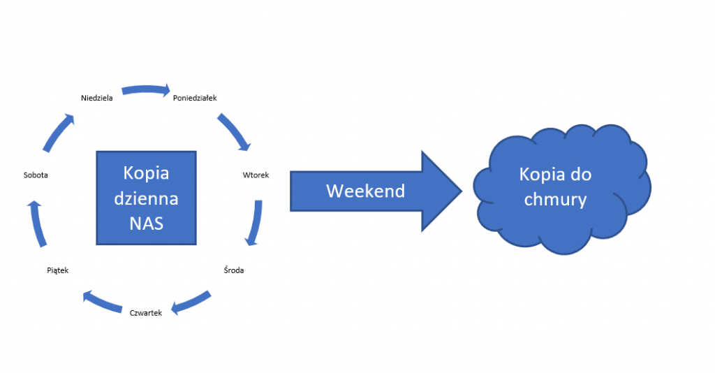 Posłużmy się jednak powyższym prostym scenariuszem z kopią główną i dodatkową. Mamy wybrane dwa repozytoria: NAS i przestrzeń w chmurze. Najlepszym rozwiązaniem będzie ustawienie kopii wykonywanej raz dziennie na urządzenie NAS oraz dodatkowej kopii wykonywanej raz na tydzień do chmury. Taki harmonogram pozwoli na niezawodne zabezpieczenie naszych danych.