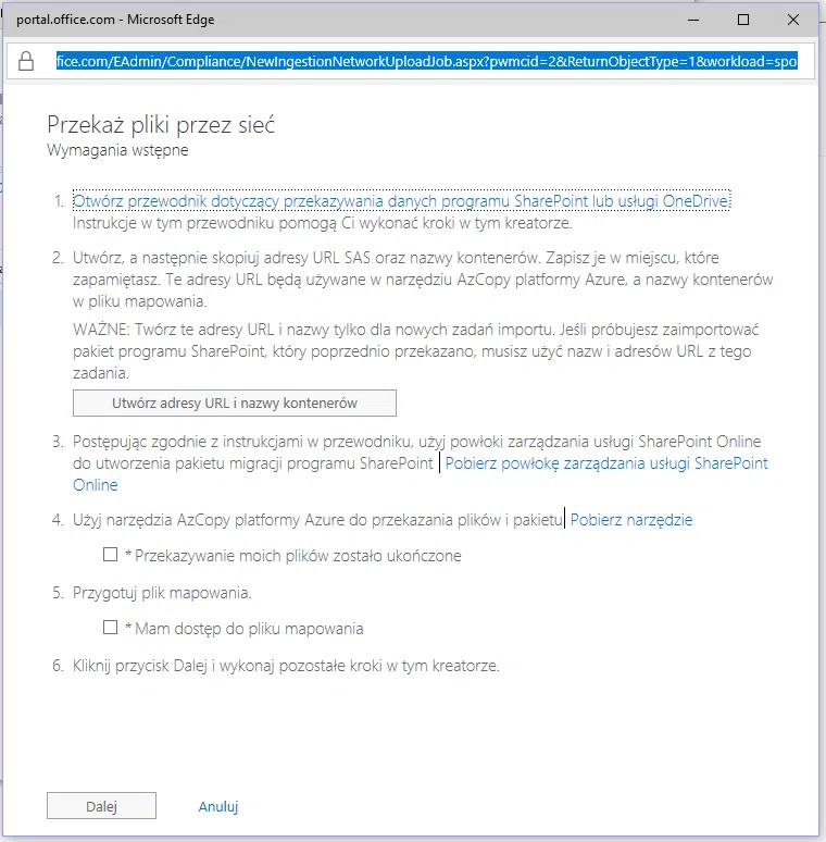 Aby możliwy był import do usługi ImportPST, należy zainstalować aplikację AzCopy: