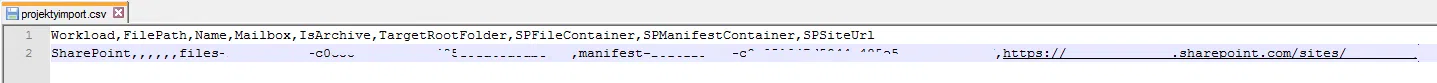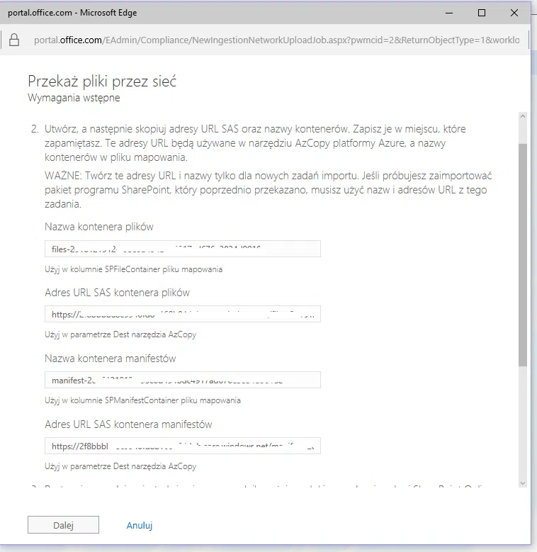 Pozostał ostatni etap, czyli import danych z Azure do Sharepoint Online z użyciem pliku mapowania, który należy przygotować. Zawiera on adresy plików i manifestów Azure oraz adres docelowej biblioteki i wygląda tak: