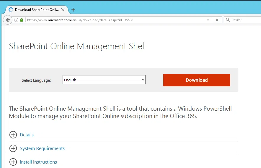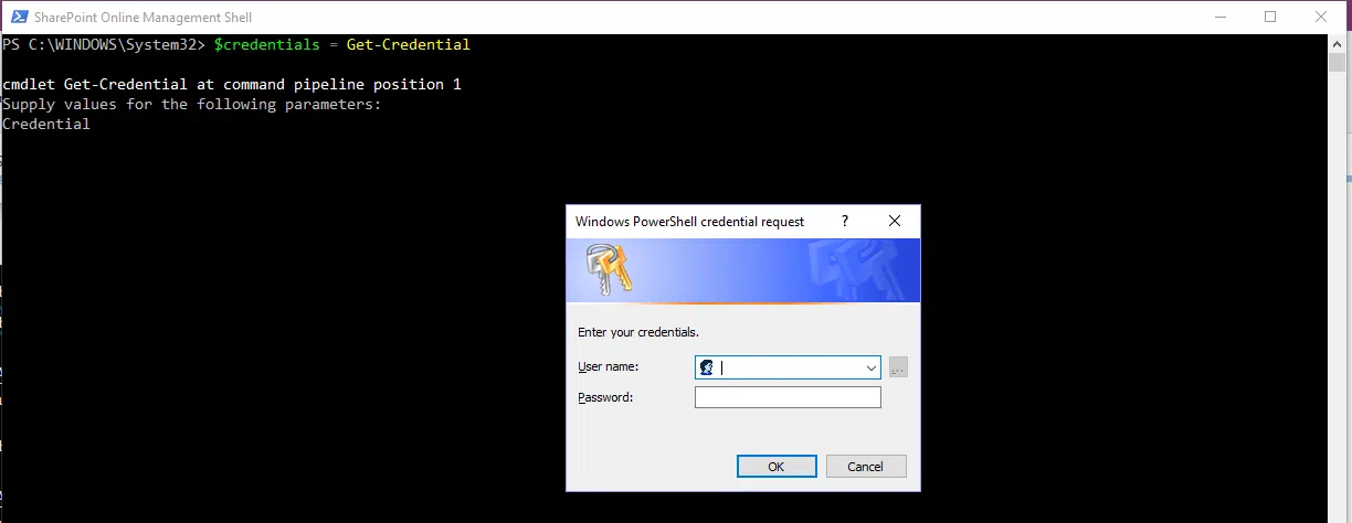 Uruchamiamy Sharepoint Online Management Shell i wprowadzamy administracyjne poświadczenia do Sharepoint Online w naszej dzierżawie Office365: