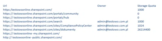 Poprawność połączenia można sprawdzić komendą, która wylistuje dostępne kolekcje Sharepoint w naszej dzierżawie Office365: