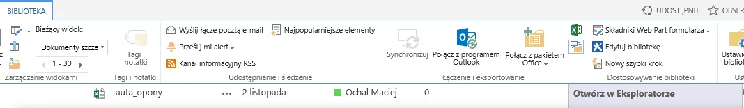 • TargetWebUrl – adres Url docelowej, głównej strony biblioteki, do której będą importowane dane. Jeżeli nie jesteśmy pewni, jak powinien wyglądać, można zalogować się do niej przez przeglądarkę i wybrać opcję „Otwórz w Eksploratorze”: