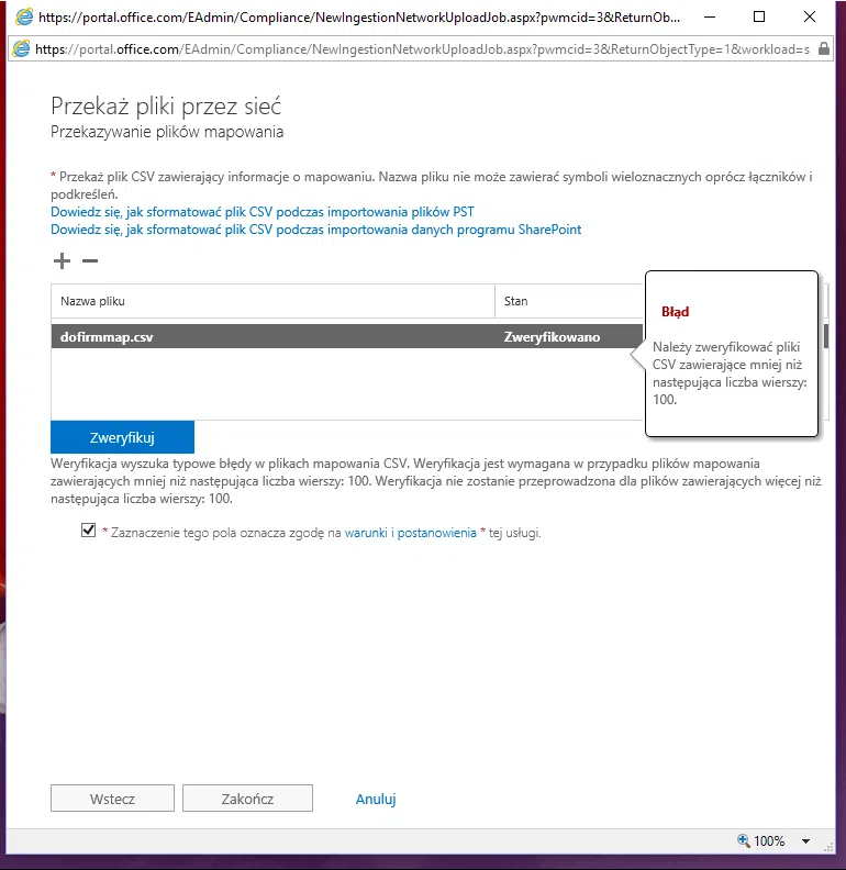 W kolejnym kroku wskazujemy plik .csv mapowania i wybieramy „Zweryfikuj”