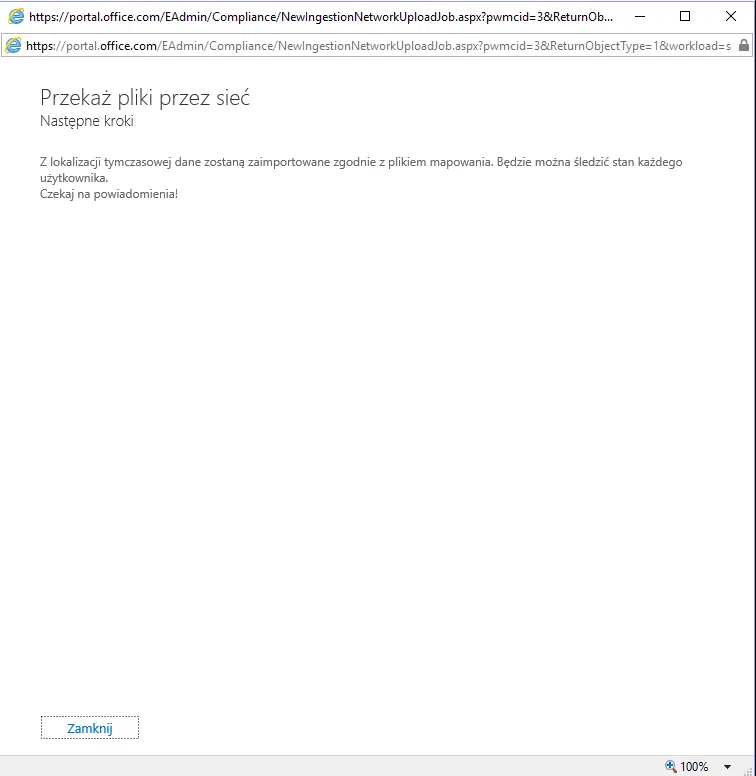 Posiadając już gotowy plik mapowania oraz dane zaimportowane do Azure, przechodzimy do menu przekazywania danych, które otworzyliśmy na początku tego procesu, czyli do okienka „Przekaż pliki przez sieć”: