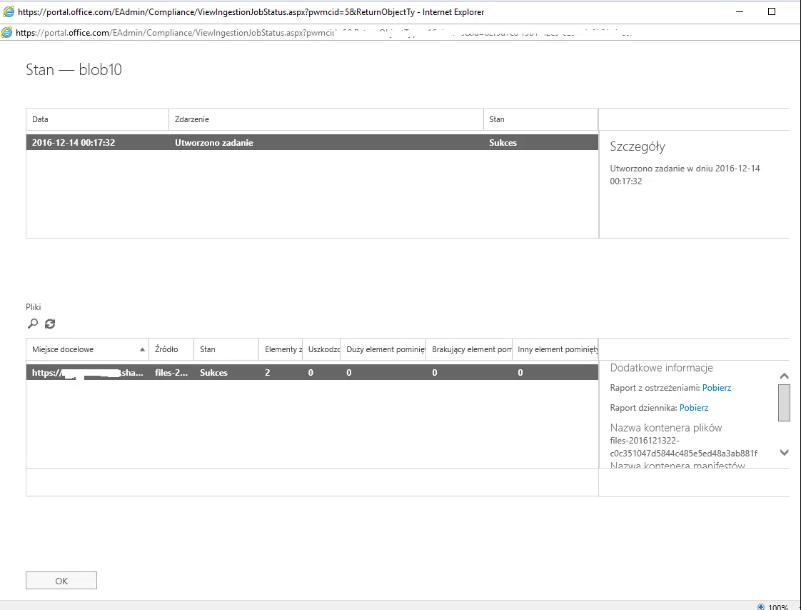 W oknie stanu dostępne są szczegółowe raporty dotyczące błędów i przebiegu operacji importu, które można pobrać jako pliki tekstowe. Po pomyślnym imporcie pojawi się informacja o ilości skopiowanych plików, a status operacji w kolumnie „Stan” zmieni się na „Sukces”.