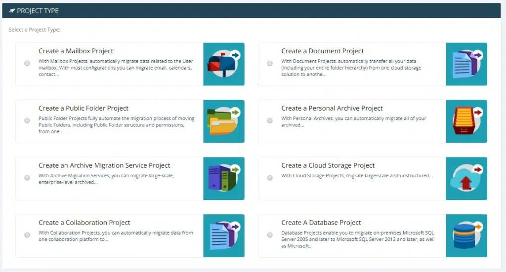 – poczta Exchange 2007,2010,2013,2016, Exchange Online, G-Suite, Open-Xchange, Zimbra i z innych po IMAP, – zasoby chmurowe – między AWS i Azure, – pliki Google Drive, Dropbox, OneDrive dla Biznesu, Box, serwery plikowe, – dokumenty Office365 groups, sharepoint, – folder publiczne, – archiwa poczty Exchange, Exchange Online, pliki pst, G-Suite, – archiwa poczty zbierane na macierzach i serwerach plików łącznie z odbudowaniem linków do każdego z obiektów, – migracja między wersjami bazy danych SQL i Azure SQL.