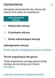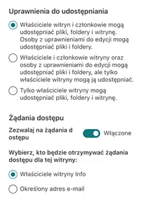 Ważnym elementem jest określenie czy użytkownicy mogą udostępniać zasoby z witryn innym. Jest możliwość udostępnienia pliku osobie, która nie ma dostępu do witryny. Do tego konieczne jest ustalenie, kto będzie zatwierdzał takie żądania dostępu.