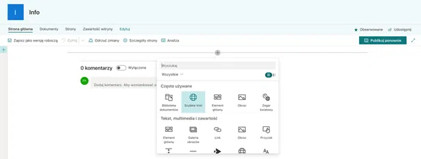 Po utworzeniu strony głównej, można zająć się konfiguracją witryn odpowiedzialnych za przetrzymywanie plików. Każda witryna w domyśle ma dodaną bibliotekę dokumentów. Należy dostosować widok strony w taki sposób, aby po jej wczytaniu pliki były widoczne dla użytkownika. W tym celu możesz dodać do sekcji głównej witryny składnik – Biblioteka Dokumentów.