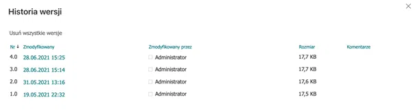 Świetnym funkcjonalnością, o której należy wspomnieć jest wersjonowanie plików. Takiego rozwiązania brakuje na popularnie używanej usłudze udostępniania plików w środowiskach lokalnych. Z tego również powodu wiele firm decyduje się na migrację swoich zasobów do Sharepoint.