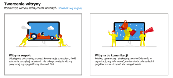 Wybierając pierwszy rodzaj witryny, oprócz niej samej, utworzysz grupę usługi Microsoft 365. Będziesz miał możliwość korzystania ze składowych usług pakietu: Exchange, Planner, Teams i innych. Dodatkowo można zintegrować wszystkie te narzędzia na swojej witrynie.