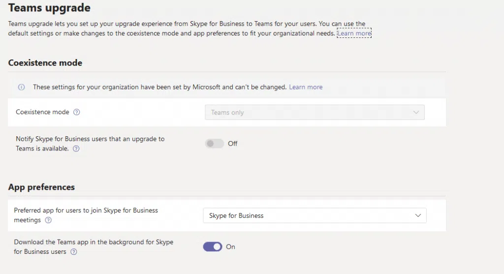Opcji współistnienia obu aplikacji jest więcej, wybieramy jedną z opcji dla organizacji oraz przypisujemy do każdego lub wybranych użytkowników. Oprócz podanych Islands i TeamsOnly, są jeszcze:
