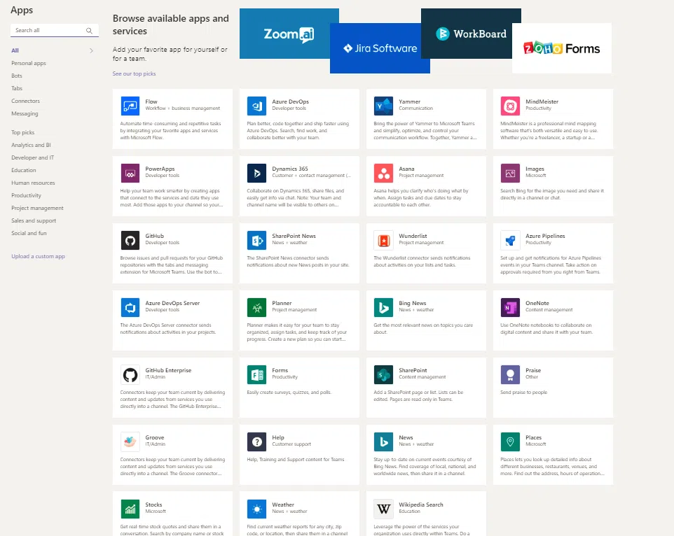 Dodatkowo umożliwia tworzenie kanałów i integrację innych aplikacji w ramach jednego widoku. W ten sposób można udostępniać pliki OneDrive, dodać zadania w aplikacji Planner, notatki w OneNote, tabele Excel, ale też np. udostępniać wpisy na Githubie. Możliwości jest wiele, ale też administrator ma nad nimi kontrolę – może zezwolić bądź zablokować używanie konkretnego programu.