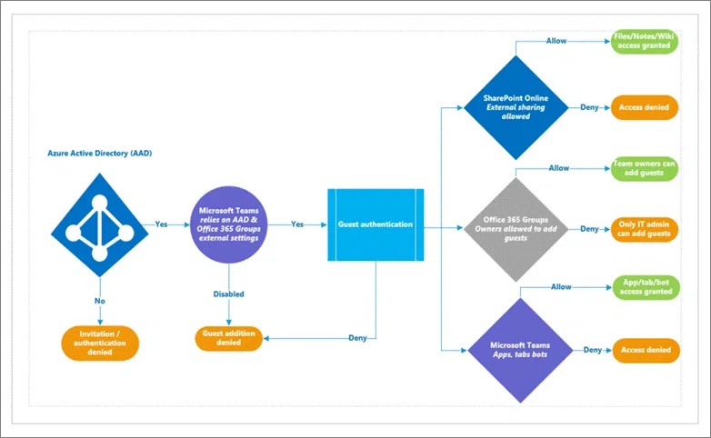 Pod spodem graf prezentujący organizację uprawnień w usłudze Teams – na każdym z poziomów, od lewej do prawej na obrazku – znajdują się blokady dostępu, którymi możemy sterować, np. zezwolić na dostęp zewnętrzny do naszej organizacji w celu współpracy z grupami Office365 (wymagane dla spotkań Teams), ale zablokować dostęp do plików na Sharepoint/OneDrive.