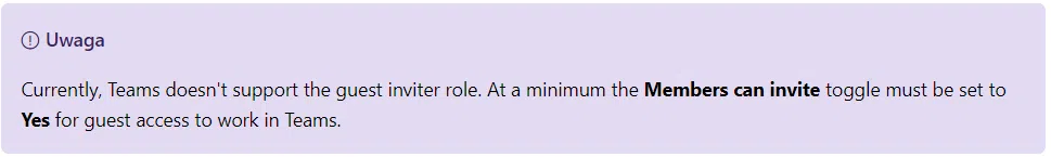 W chwili pisania tego artykułu rola „Guest Inviter” jeszcze nie działa i należy mieć włączoną opcję „Members can invite”, czyli członkowie grupy mogą zapraszać gości spoza organizacji.