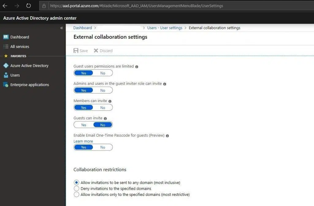 Absolutnym minimum, które umożliwi kontakt ze światem zewnętrznym z naszego Office365 jest włączenie możliwości wysyłania zaproszeń w Azure Active Directory oraz nadanie uprawnień dla osoby lub grupy do wysyłania zaproszeń na zewnątrz.