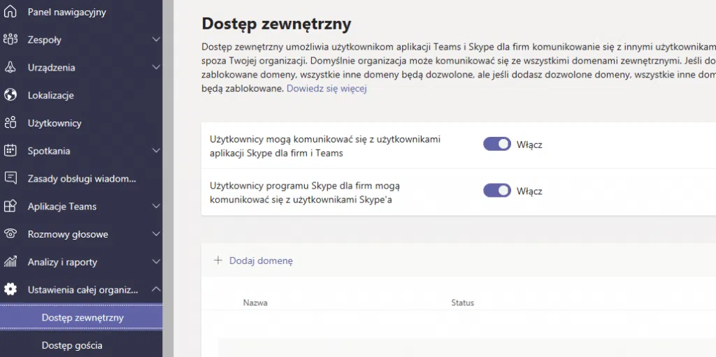 Poziom Microsoft Teams – tutaj ograniczamy lub zezwalamy na dostęp zewnętrzny na poziomie aplikacji Teams. Mamy też możliwość zablokowania komunikacji przy użyciu Skype dla firm. Tutaj także jest opcja dodania domen zablokowanych w komunikacji