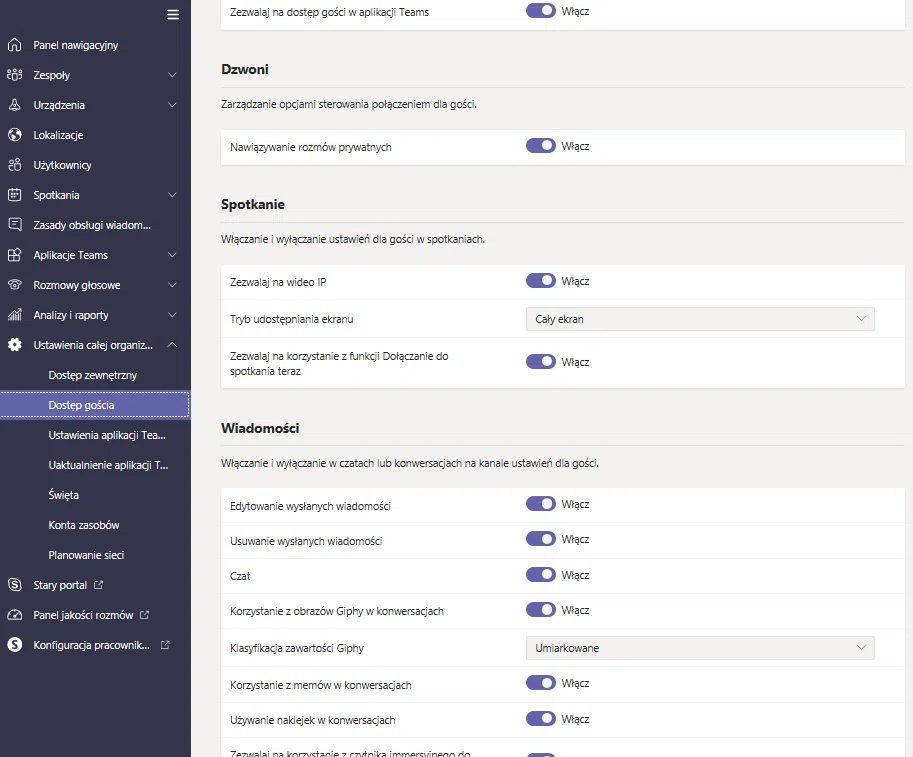 Oprócz ogólnego poziomu, mamy dostępne dodatkowe ustawienia szczegółowe dla kont typu gość, czyli spoza organizacji. Po włączeniu opcji „Zezwalaj na dostęp gości w aplikacji Teams” otwiera się dostęp do kolejnych szczebli blokad i zezwoleń, które możemy dostosować do wymagań naszej firmy.