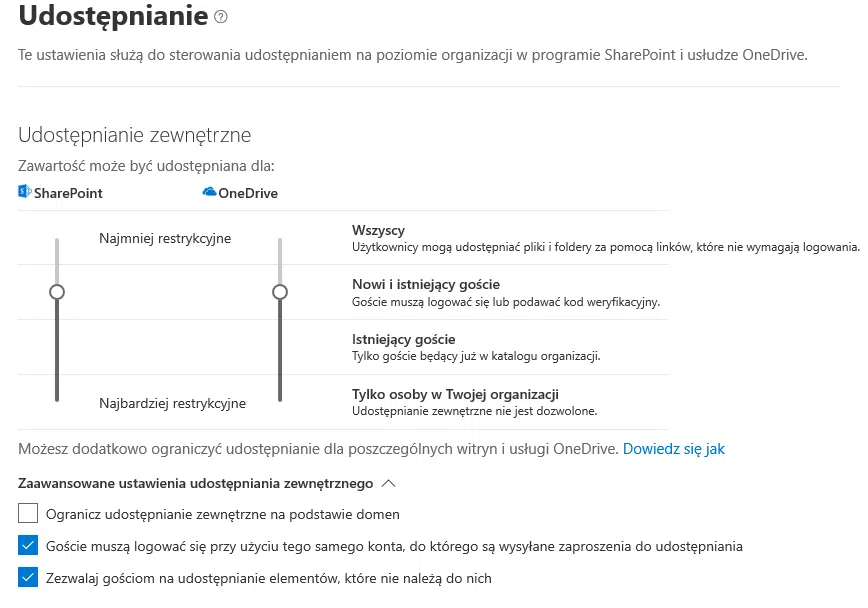 Dodatkową opcją przy regulowaniu dostępu do plików w ustawieniach udostępniania Sharepoint Online są opcje zaawansowane na dole strony, dzięki którym dostosowujemy poziom uprawnień dla kont zewnętrznych (gości).