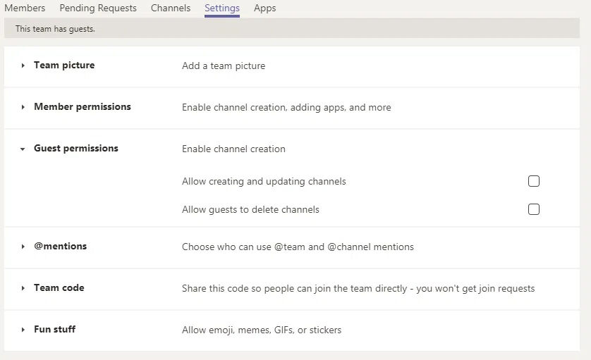 Poziom zespołu Teams – ostatnim miejscem, gdzie możemy zmienić sposób działania konta gościa, jest zespół Teams. Tutaj możemy dodać konta gości oraz ustawić dodatkowo poziom uprawnień dla nich, przy czym ogranicza się on już tylko do kanałów wewnątrz zespołu.