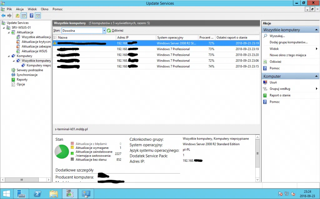 Postępy instalacji aktualizacji można obserwować po wybraniu opcji „Wszystkie komputery” w drzewie konsoli. W tym widoku widać, które aktualizacje zostały już zainstalowane na danym komputerze.